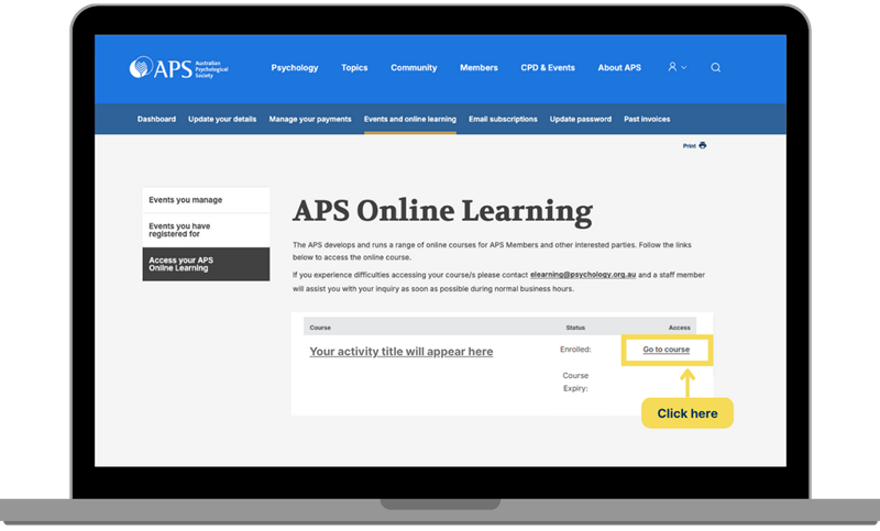 - Click on this link: https://psychology.org.au/membership/my-events-elearning/aps-elearning